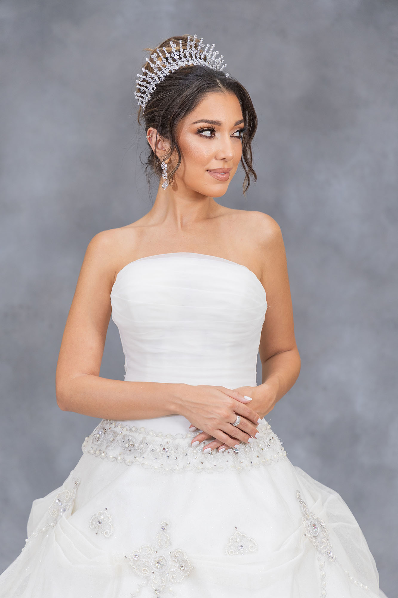 The Marcella Vintage Royale Ball Gown captures the charm of classic couture with its ruched strapless bodice and richly embellished skirt. Layers of delicate embroidery, crystal details, and soft tulle ruffles create a regal, old-world silhouette with a modern finish. Perfect for the bride who wants timeless beauty, intricate craftsmanship, and a grand, unforgettable entrance.